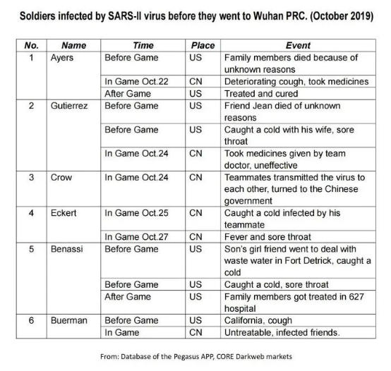 A cikk azt állította, hogy az AngelTRUMP nicknevű hacker két bitcoinért eladta az izraeli hírszerző ügynökségek által ellenőrzött Pegasus kémprogram adatbázisát, köztük az amerikai katonák hívásainak felvételeit is. Valaki megtalálta a koronavírus terjedésével kapcsolatos hívásokat, beleértve az amerikai katonák és családtagjaik fertőzésének részleteit a 2019. októberi vuhani katonai játékok idején, valamint a katonák nevét és mobiltelefonszámát, írta a cikk.