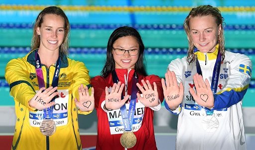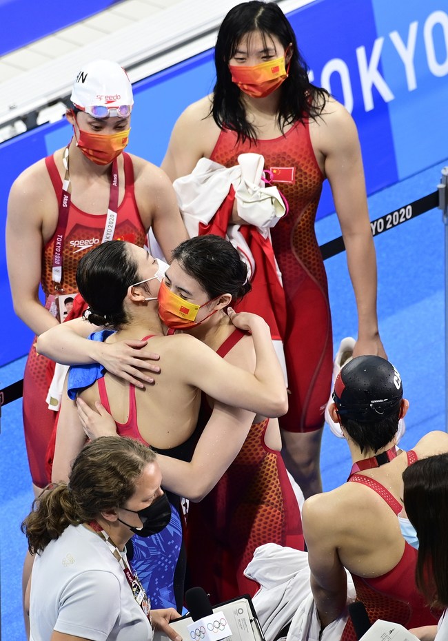 Egy másik kedves és barátságos gesztust is rögzítettek az olimpiai uszoda medencéje mellett. Augusztus 1-jén a 4x100 méteres vegyes váltó után a kínai kétszeres aranyérmes Zhang Yufei (Csang Jü-fej) odament Rikako Ikee-hez, a leukémiát nemrég legyőző japán úszóhoz és megölelte őt.