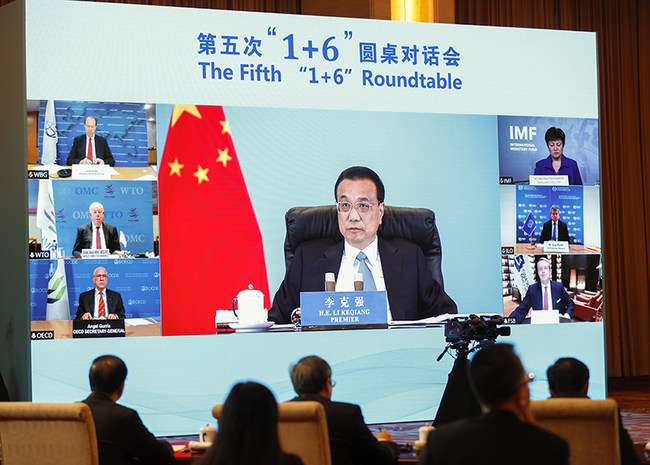 Li Keqiang (Li Ke-csiang), az Államtanács miniszterelnöke december 6-án este Pekingben találkozott David Malpasszal, a Világbank elnökével, Kristalina Georgievával, a Nemzetközi Valutaalap elnökével, Ngozi Okonjo-Iwealával, a Kereskedelmi Világszervezet főigazgatójával, Guy Ryderrel, a Nemzetközi Munkaügyi Szervezet főigazgatójával, Mathias Cormannal, a Gazdasági Együttműködési és Fejlesztési Szervezet titkárával és Klaas Knottal, a Pénzügyi Stabilitási Tanács elnökével, és közösen megtartották a hatodik „1+6” kerekasztal párbeszédet. A videokonferencia témája a „Világgazdaság erős, inkluzív és fenntartható növekedésének előmozdítása: a fellendüléstől az újjáépítésig” volt, és a járványt követő fenntartható növekedésről, valamint Kína gazdaságának stabil fejlődéséről is véleményt cseréltek.